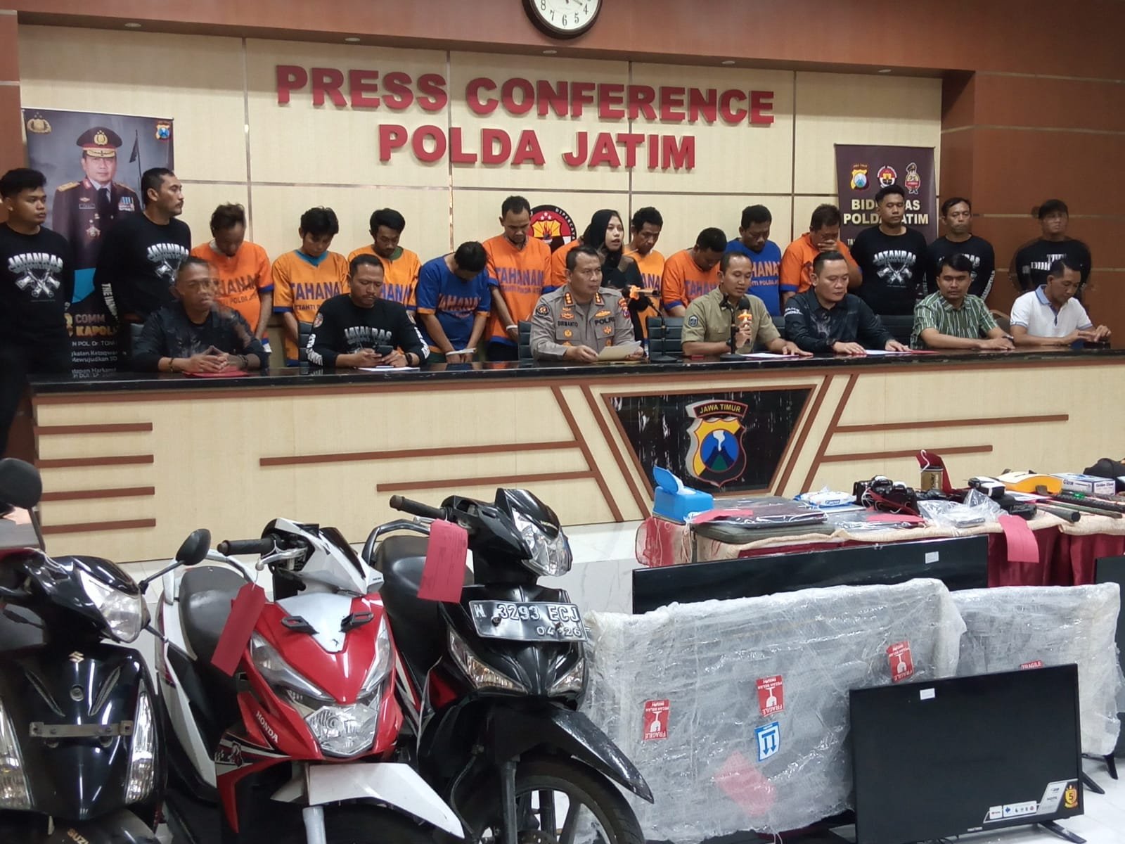 VOICEINDONESIA.CO, Surabaya – Subdit III Jatanras Ditreskrimum Polda Jawa Timur (Jatim) membekuk 10 bandit jalanan. Tujuh orang merupakan pelaku spesialis pembobolan rumah kosong, tiga orang pelaku pencurian kendaraan bermotor (curanmor).