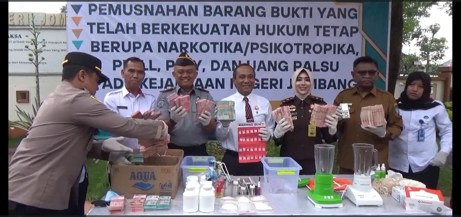 Pemusnahan barang bukti digelar di halaman kantor Kejari Jombang. Barang bukti yang dimusnahkan dari 115 perkara tindak pidana umum yang berkekuatan hukum tetap (inkrah) sejak November 2024.