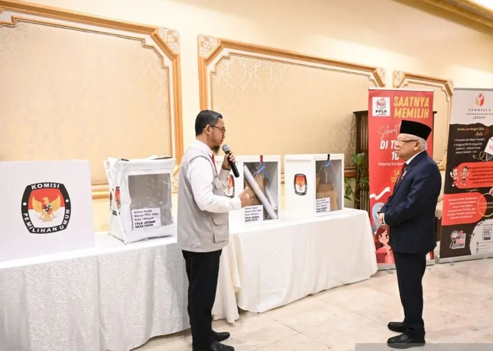 VOICEIndonesia.co, Jakarta – Wakil Presiden RI Ma’ruf Amin meninjau Sekretariat Panitia Pemilihan Luar Negeri (PPLN) Jeddah di kompleks Konsulat Jenderal Republik Indonesia (KJRI) Jeddah, Arab Saudi, Rabu, untuk mengecek kesiapan penyelenggaraan Pemilihan Umum 2024 di sana.