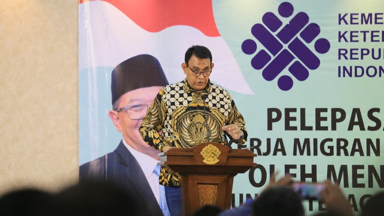 Pelepasan perdana sebanyak 250 dari 500 CPMI secara simbolis dilakukan Dirjen Pembinaan Penempatan dan Perluasan Kesempatan Kerja (Binapenta & PKK), Suhartono didampingi, Stafsus Dita Indah Sari dan Ketua Umum APJATI Ayub Basalamah di ruang Serbaguna Kemnaker, Jakarta, Minggu (3/7/2022).