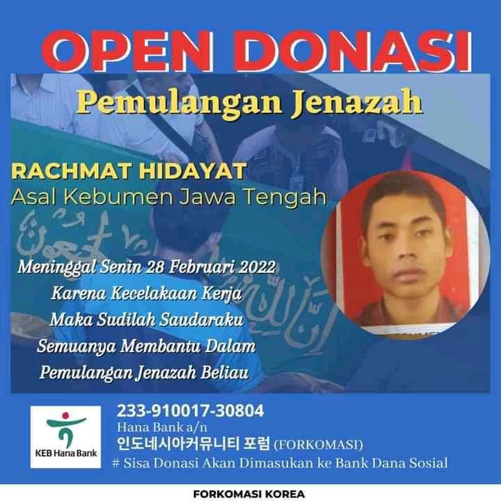 VOICEINDONESIA,JAKARTA – Seorang Pekerja Migran Indonesia (PMI) Asal Kebumen Jawa Tengah ,Rachmat Hidayat meninggal dunia karena kecelakaan kerja di Korea Selatan.