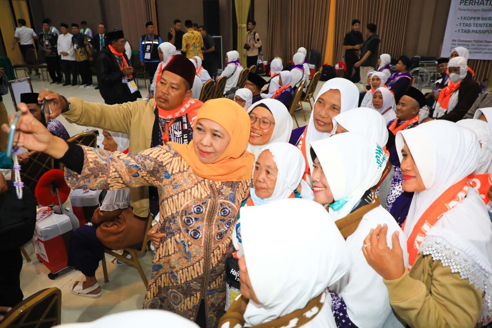 “Labaikallahumma labbaik, labbaika la syarika laka labbaik, innal-hamda wan-ni’mata laka wal mulk, la syarika lak, selamat jalan, selamat menunaikan ibadah haji,” kata Gubernur Khofifah.