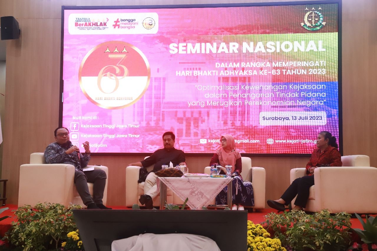 VOICEINDONESIA.CO, Surabaya – Seminar Nasional yang mengangkat tema optimalisasi kewenangan kejaksaan dalam penanganan tindak pidana yang merugikan perekonomian negara diselenggarakan secara serentak oleh masing-masing Kejati di seluruh Indonesia yang dibuka secara resmi oleh Ketua Panitia dari Kejaksaan Agung dan Bapak Jaksa Agung RI menyampaikan Keynote Speaker secara virtual, yang kemudian dilanjutkan dengan penyampaian materi oleh para Narasumber di wilayah masing-masing Kejati.Â