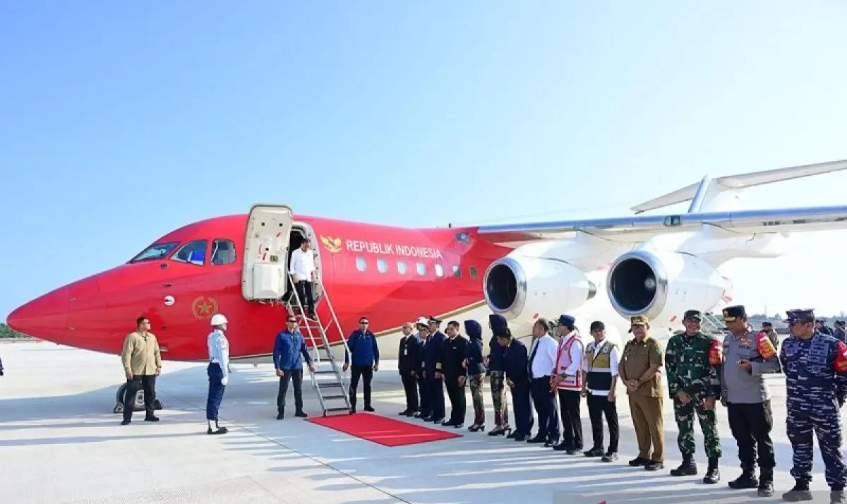 Presiden Jokowi menumpang Pesawat Kepresidenan RJ-85 saat mendarat di Bandara Nusantara tersebut.*